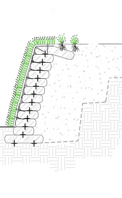 Envirolok is engineered to stabilize slopes and shorelines permanently. Unlike traditional erosion control products, Envirolok stabilizes the underlying soils and creates an encapsulated barrier, protecting them from further erosion. The bag-fill mix has been developed in collaboration with our engineers and horticulturalists to maximize strength and provide ideal growing conditions for native plantings. For more extreme water conditions, Envirolok’s specialized spike system is designed to work with various reinforcement systems to increase strength and withstand the forces of water.